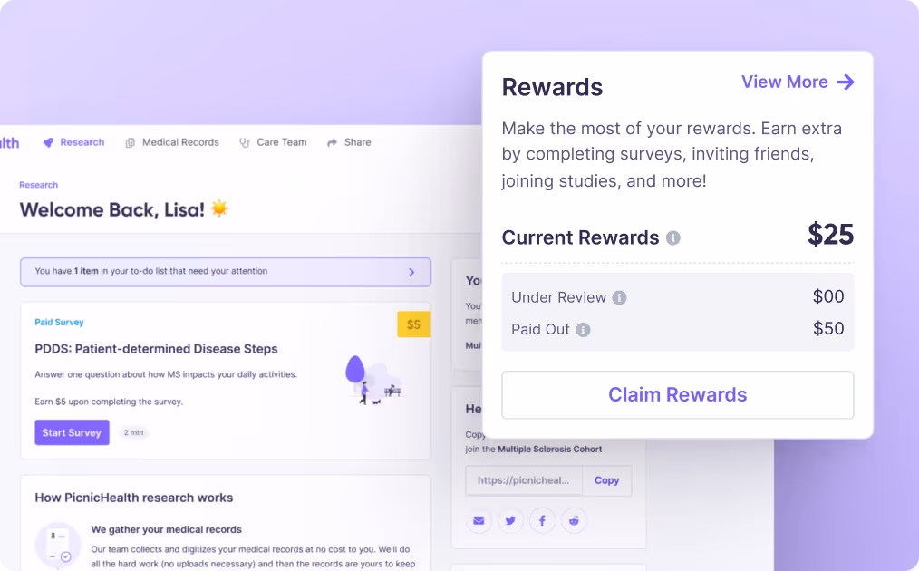 Now, it's easier than ever to access and claim your rewards directly from your PicnicHealth Research Dashboard. Just click on "Claim Rewards," and we'll take care of the rest. Your Giftbit gift card will be sent to your email within a week. Keep track of your rewards status and total payout right from your dashboard. Please note that to receive rewards, you'll now need to login and click on "Claim Rewards."
